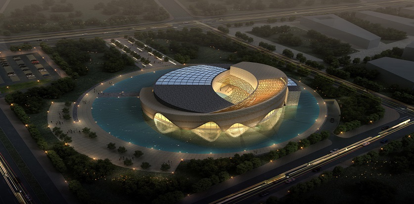 我們研究的結論讓我們形成了創作博物館造型的主要指導思想:擁抱。這個詞強調了本地區人們不同文化相互靠近及融合的需求,就像一個母親要擁抱她的孩子,也好比是陰和陽相互擁抱達到平衡。這樣就產生了兩條手臂擁抱的概念,此概念通過代表兩邊民族的兩個扭曲建筑來表現。每個建筑都有與其對應的民族特色。代表漢族特色的建筑表面飾有龍鱗,而代表新疆當地特色的有磚格局墻,兩邊門洞入口都有金色馬賽克裝飾代表當地山脈,而這些倒映在建筑周圍的水面鋪墊上,代表著當地純潔的河流源自于高山。